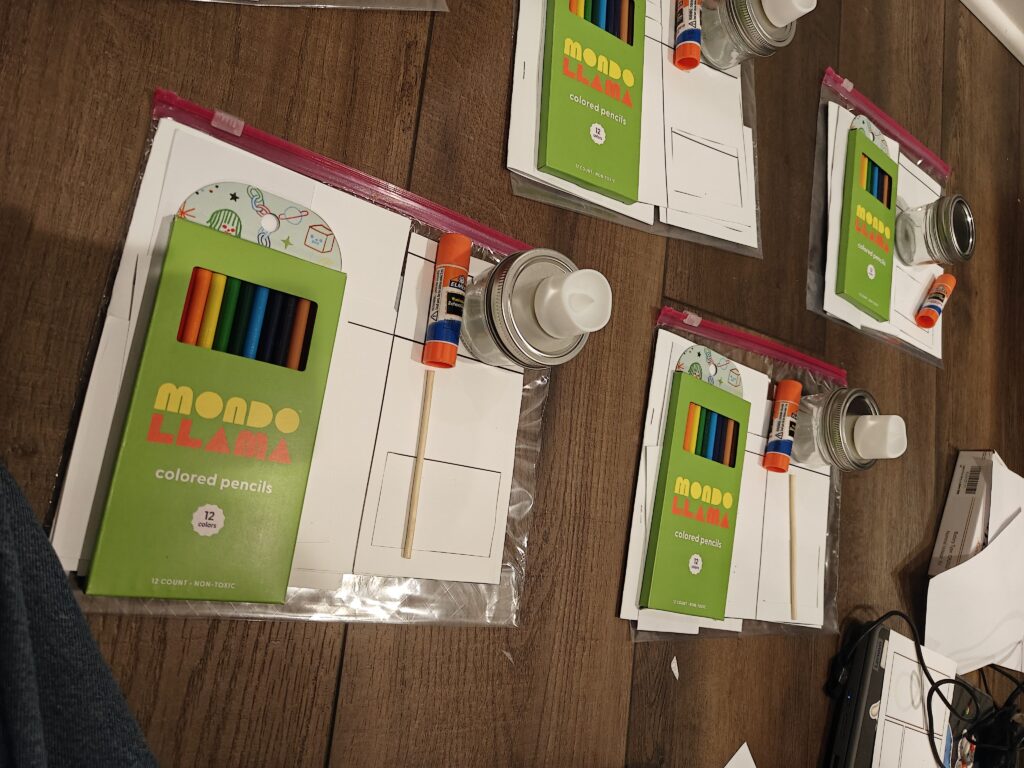 Making care kits with snacks or school supplies